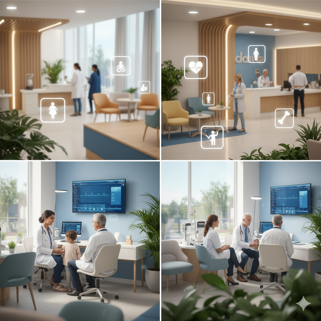 1º piso está a recepção (atendimento permanente 24/24h); os consultórios, consultas de clínica geral e de especialidades diversas, (medicina interna, pediatria, otorrinolaringologia, ortopedia, medicina dentária, ginecologia/obstetrícia, cirurgia geral, cardiologia, oftalmologia, medicina ocupacional/check-ups. S.O, sala de gessos e pequena cirurgia, exames complementares de diagnóstico: radiologia digital, TAC, ECG. Optometria, ecografia, laboratório de análises clínicas, audiometria e espirometria).